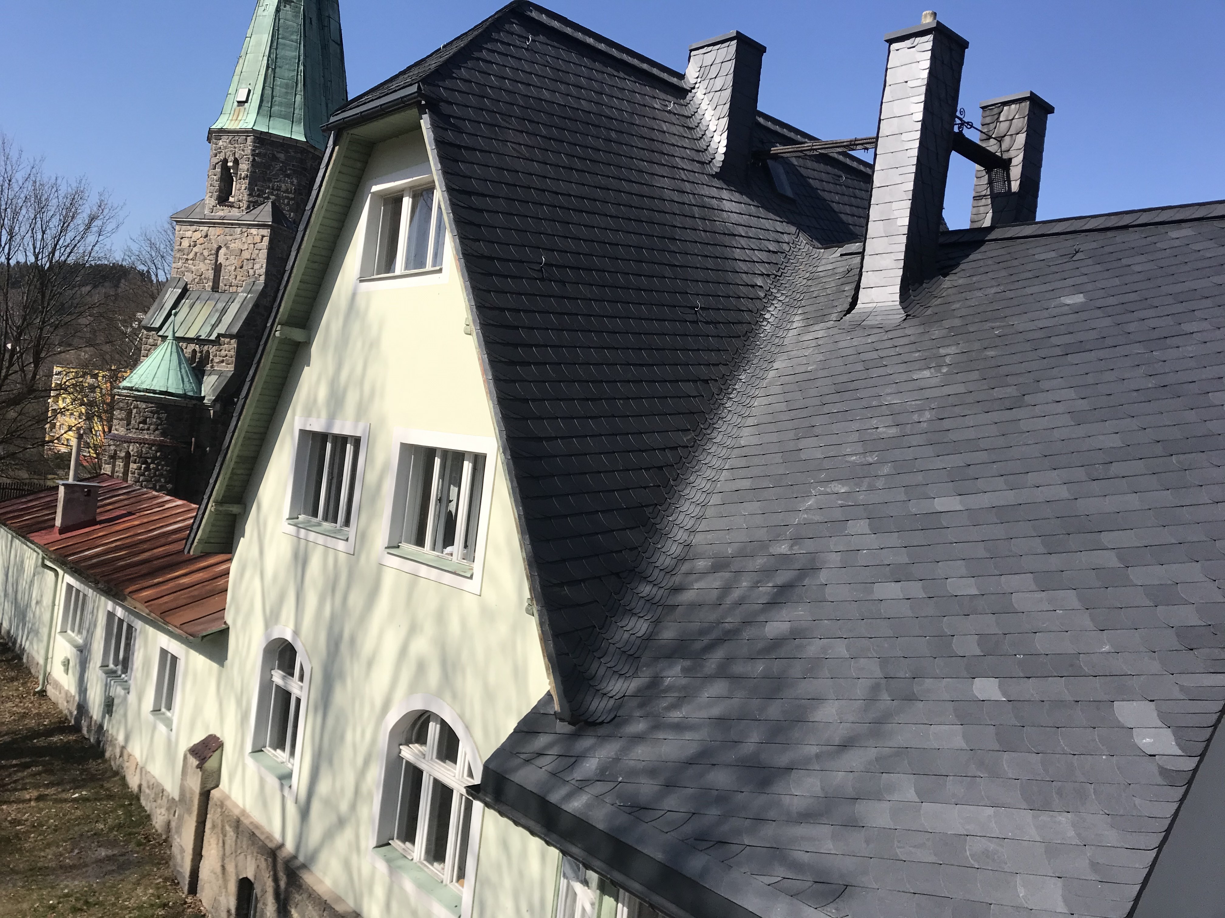 Střecha fary evangelické farnosti v Nejdku Kompletní rekonstrukce střechy fary evangelické farnosti v Nejdku. Materiál – Přírodní břidlice, klempířské prvky – Prefa Antrazit, těsné podstřeší